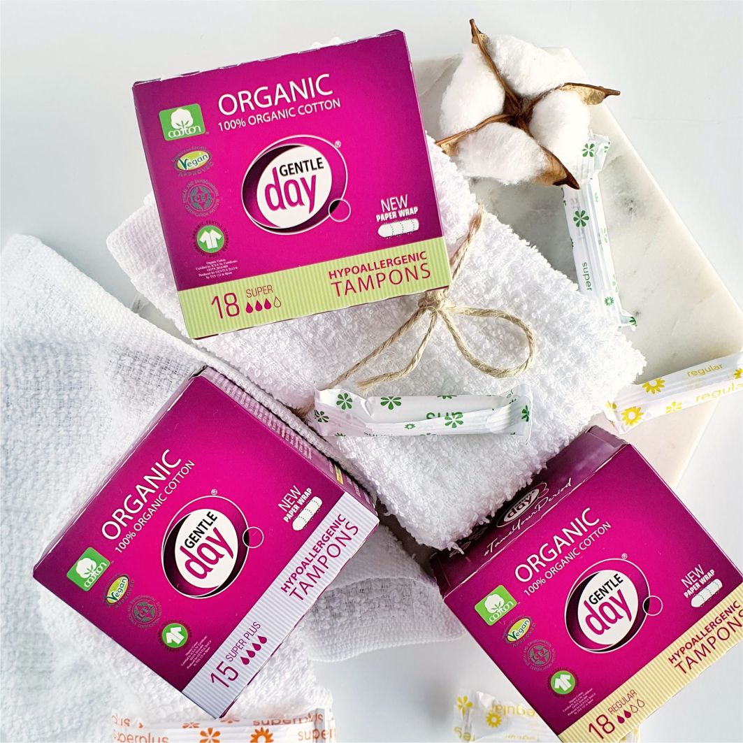 Tampony GENTLE DAY® wykonane są w 100% z bawełny certyfikowanej GOTS oraz wolne od wiskozy i włókien syntetycznych, dlatego tampony zapobiegają wysuszeniu pochwy, podrażnieniom i alergiom.